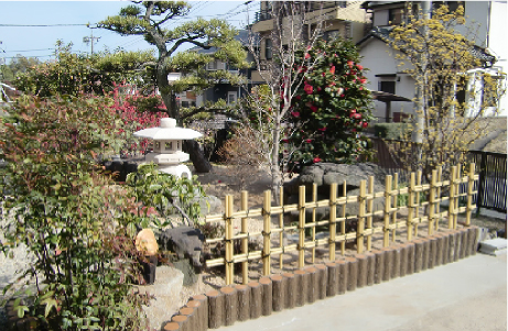 車庫の拡幅工事を行い、グローベン、擬木・四ツ目垣をあしらいました。