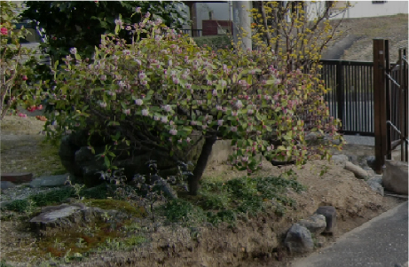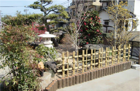 車庫の拡幅工事を行い、グローベン、擬木・四ツ目垣をあしら